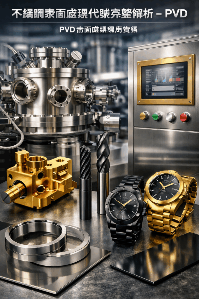 Penjelasan Lengkap Kod Rawatan Permukaan Keluli Tahan Karat: PVD (Pemendapan Wap Fizikal) x Sesuai untuk peralatan semikonduktor, komponen ketepatan CNC, bahagian penampilan perindustrian dan pembuatan peralatan mewah x Kaedah pemprosesan – salutan vakum